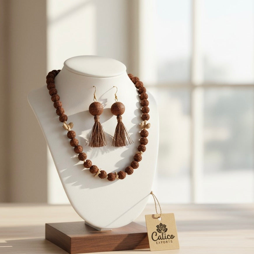 Handcrafted with precision and sustainability in mind, this elegant jewelry set is made from natural coconut husk fiber. Featuring intricate detailing and a deep red bead finish, it brings together eco-conscious design with timeless beauty.